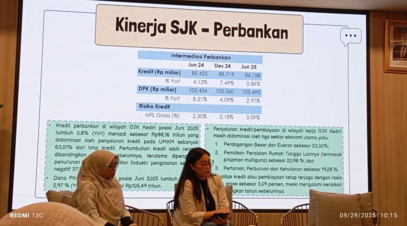 Kinerja Industri Jasa Keuangan di Wilayah OJK Kediri Sampai dengan posisi Juni 2025, penyaluran kredit perbankan di wilayah OJK Kediri tumbuh 0,86 persen (YoY) menjadi Rp 86,16 triliun yang didominasi penyaluran kredit UMKM sebanyak 63,01 persen dari total kredit.