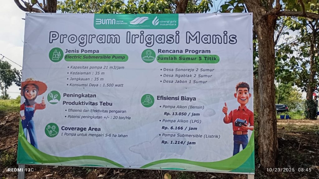 Progam Irigasi Manis membangun sumersible sebanyak 5 titik yang tersebar di Desa Ngablak, Jabon dan Sonorejo. Satu sumersible dapat mengairi 5 sampai 6 hektar lahan dan potensi peningkatan hasil panen tebu mencapai 20 ton per hektar.